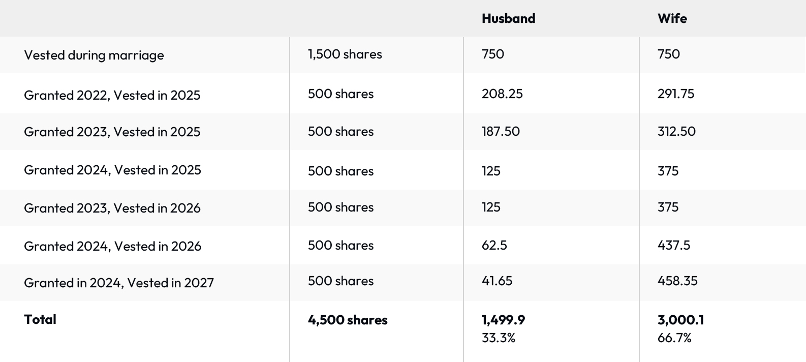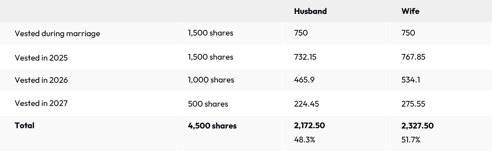 Here, when we total it up, including the 1,500 shares that vested during the marriage, Wife receives 3,000.1 shares under Nelson, and Husband receives 1,499.9 shares.