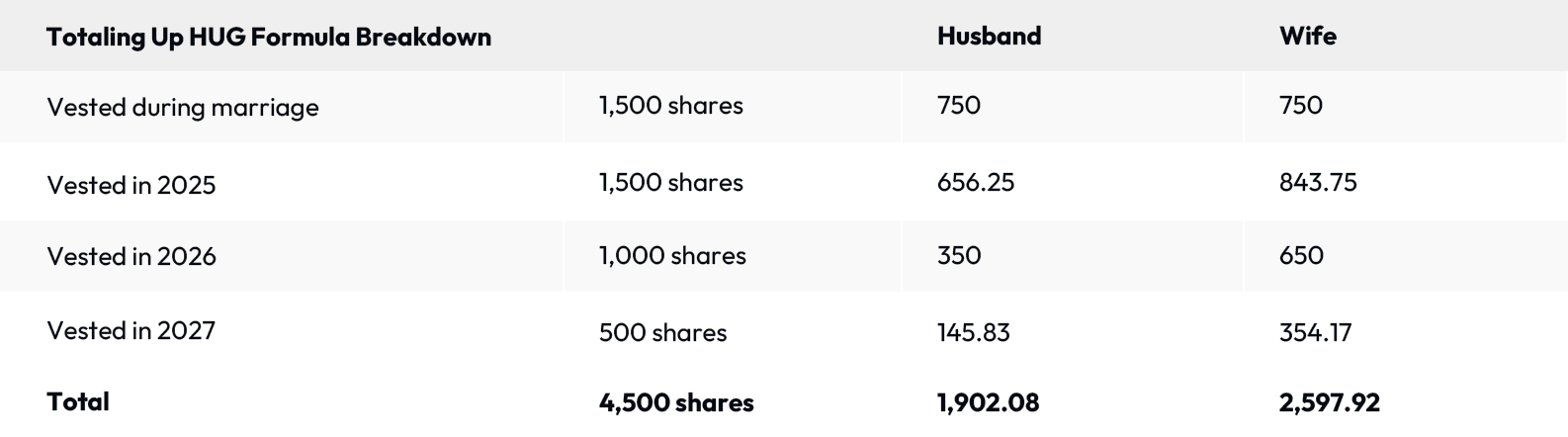 - The Hug formula is more favorable to the non-employee spouse because more of the shares will be considered community.